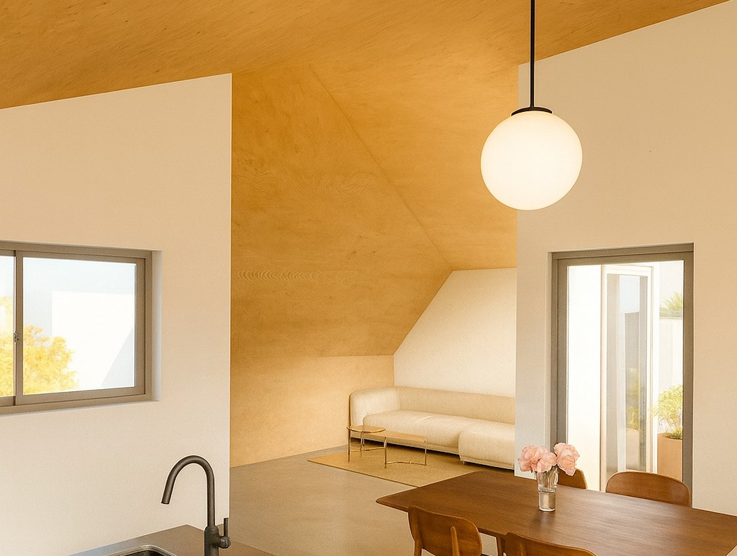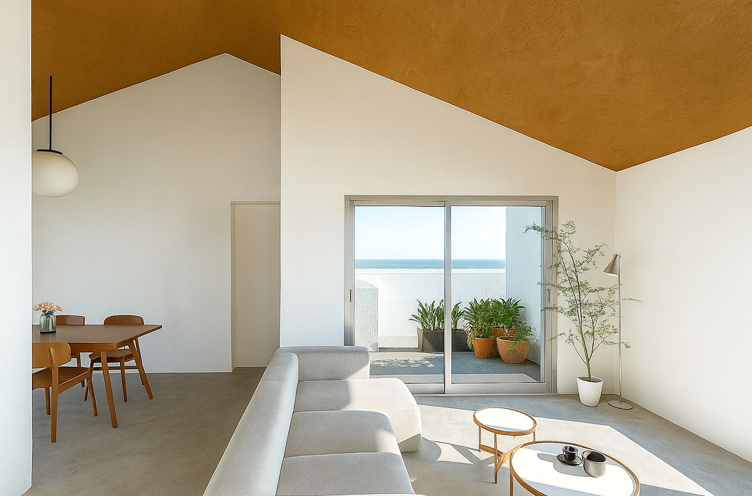 上階住戸は伸びやかな天井高と切妻屋根による斜め天井を採用。面積以上のゆとりと、室内デザインを楽しむ贅沢をもたらします。