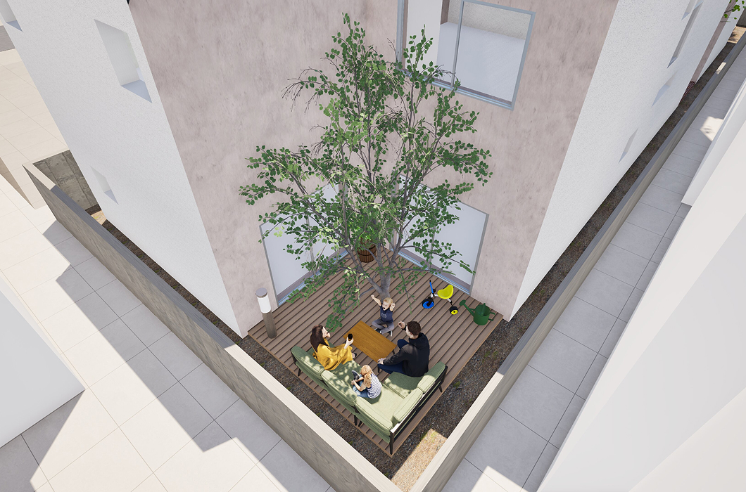 上階住戸には、高木の植栽が視線をやさしく遮り、プライバシーを しっかりと確保しながら、四季の移ろいを身近に感じられる 心豊かな日常を演出します。
